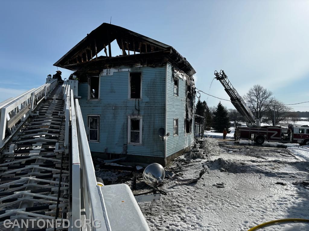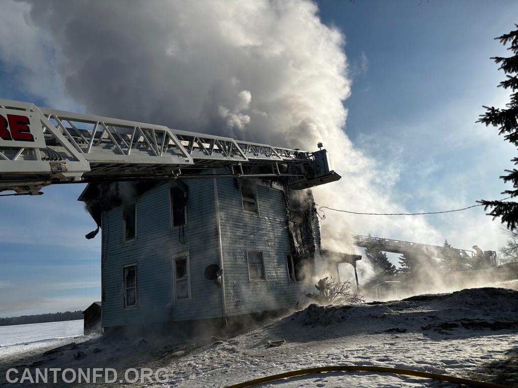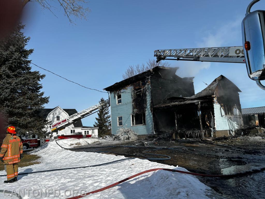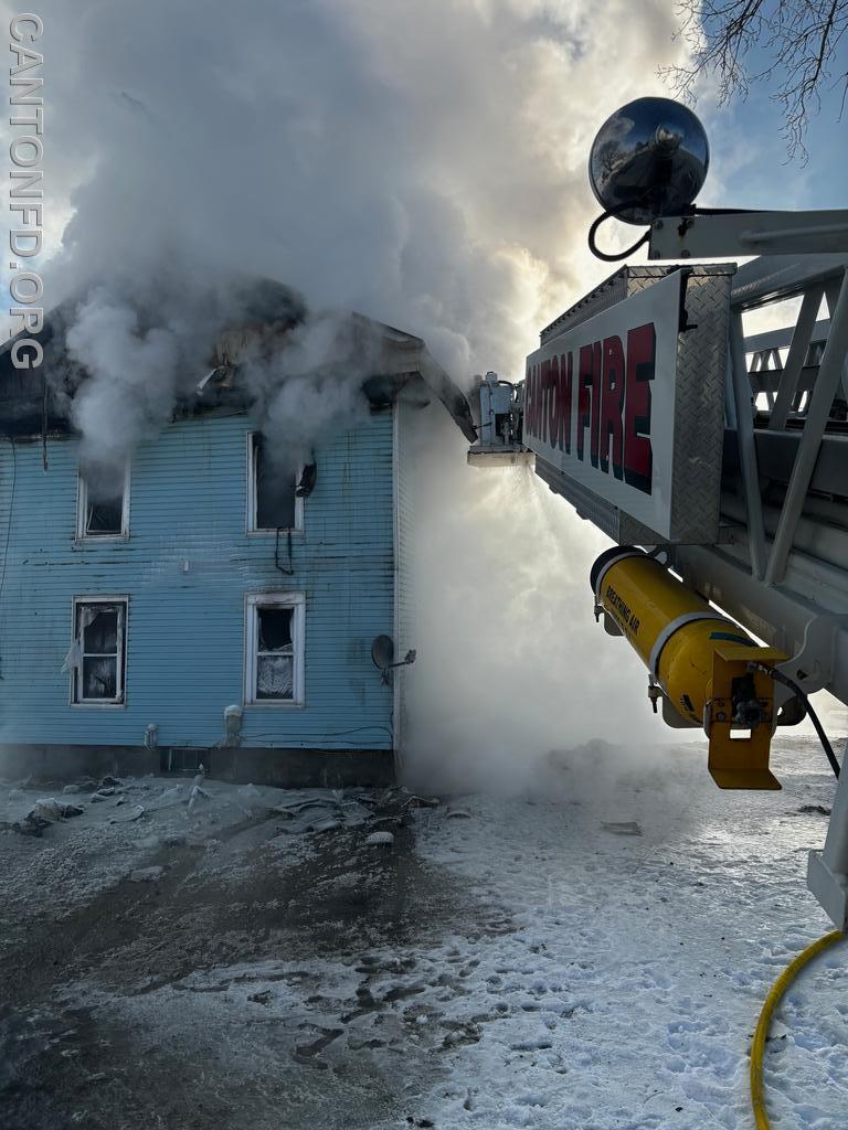 Canton Fire Department was dispatched at 0651 to respond with Tower 1 to a working structure fire on State Highway 68 in Lisbon. Tower 1's crew arrived on scene, reported to Lisbon Command (19-1), and was tasked with setting up on the "B" side of the structure to assist in fire suppression and overhaul operations on the second floor and roof area on their half of the house. Ogdensburg Fire Quint 1 was set up on the opposite side of the house performing the same function. Both truck crews, along with ground crews, worked together to knock down the rest of the fire in the upper floor and attic area, then finished up with overhaul operations until the fire was fully extinguished.