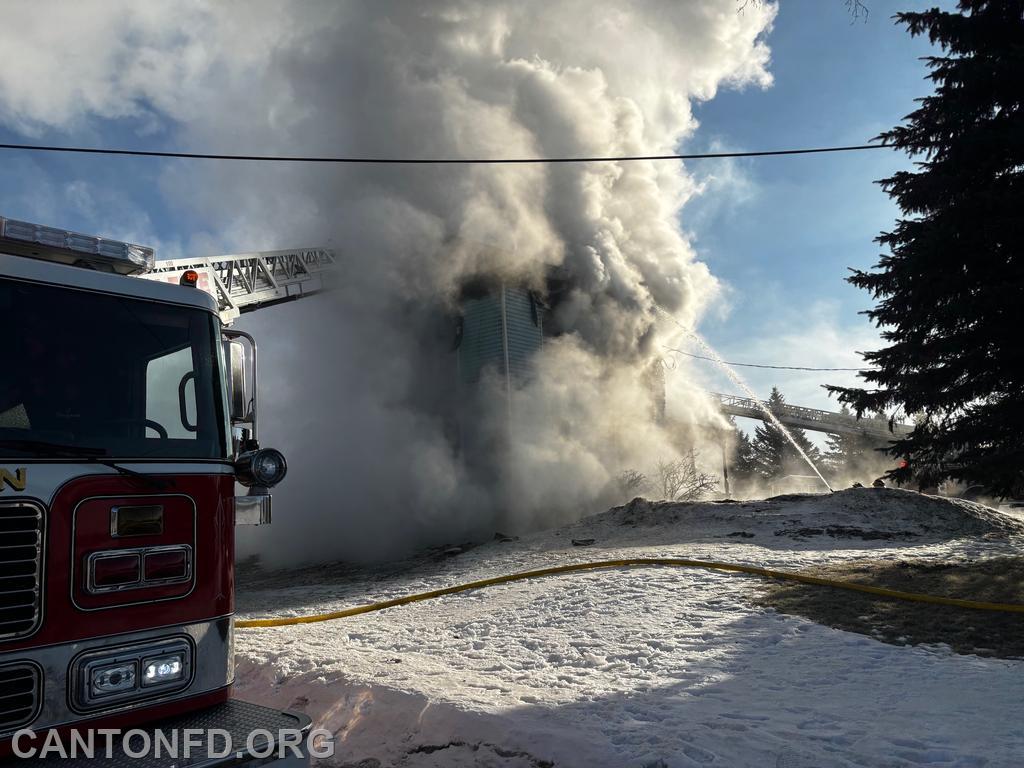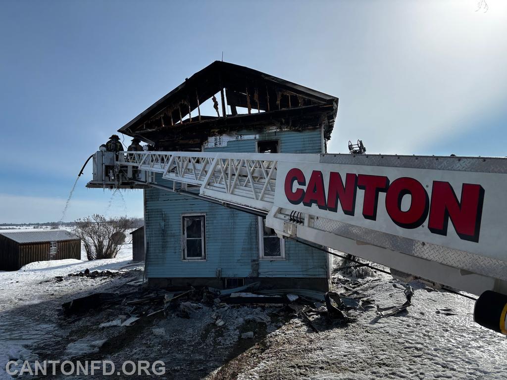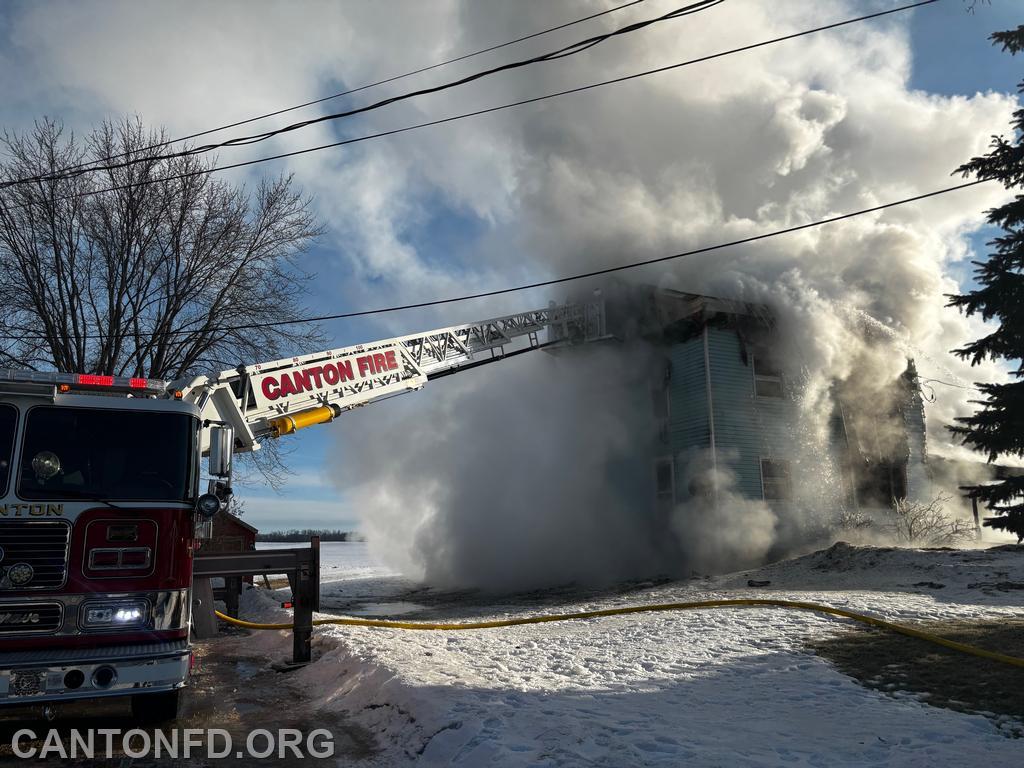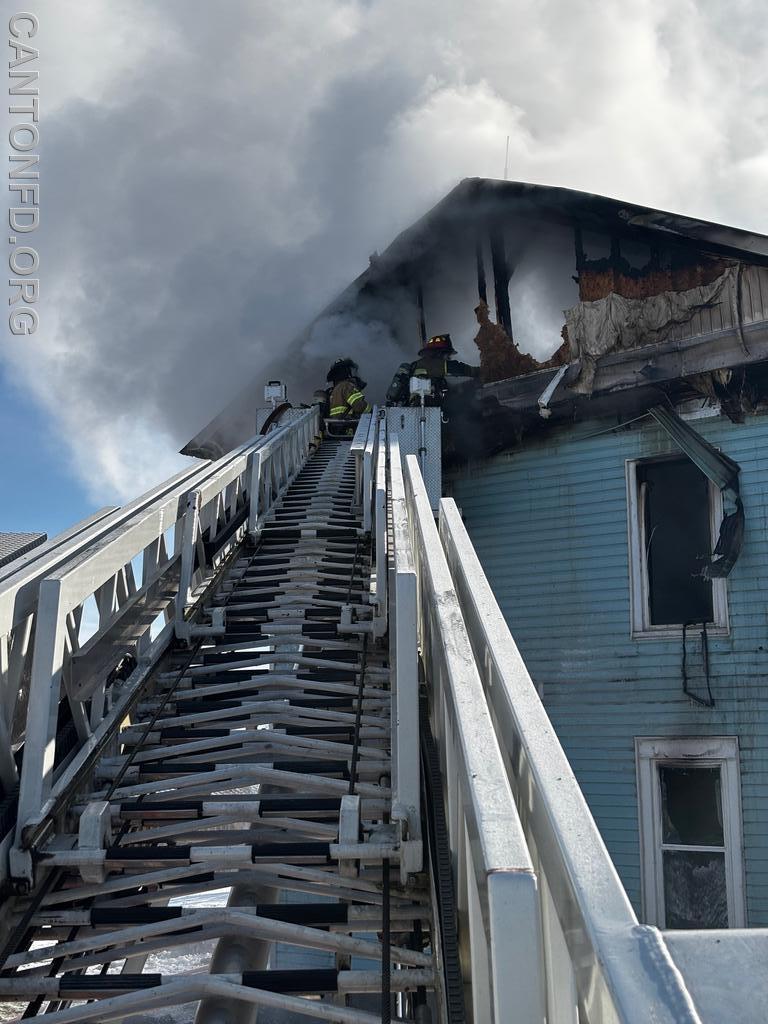 Canton Fire Department was dispatched at 0651 to respond with Tower 1 to a working structure fire on State Highway 68 in Lisbon. Tower 1's crew arrived on scene, reported to Lisbon Command (19-1), and was tasked with setting up on the "B" side of the structure to assist in fire suppression and overhaul operations on the second floor and roof area on their half of the house. Ogdensburg Fire Quint 1 was set up on the opposite side of the house performing the same function. Both truck crews, along with ground crews, worked together to knock down the rest of the fire in the upper floor and attic area, then finished up with overhaul operations until the fire was fully extinguished.